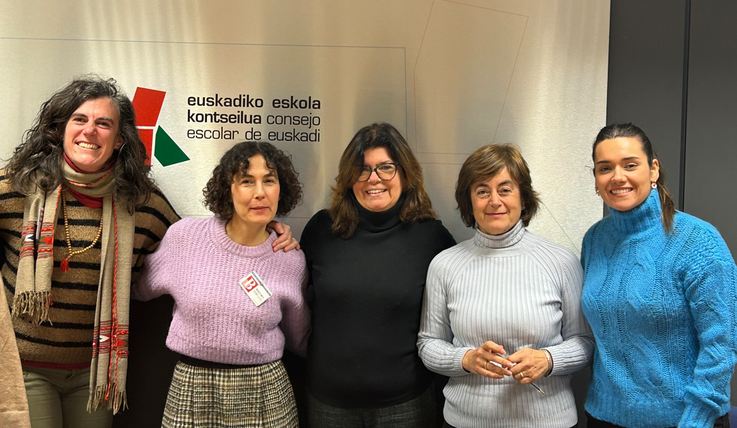 Dentro de esta misma línea de trabajo, profesoras de los centros Berrio-Otxoa (Ainara Madariaga Garcés Fayos) y Jesuitak Indautxu de Bilbao (Nuria Santaularia Hurtado y Ana Martinez Diego) y nuestra compañera del equipo de Educación Formal María Lezáun Tola se reunieron con la presidenta (Maite Alonso Arana) y la secretaría técnica (Eva Blanco) del Consejo Escolar de Euskadi.