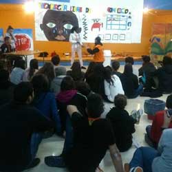 A continuación, siguieron trabajando la campaña a través del Teatro Foro para preparar la acción de calle del día siguiente.La noche del sábado se divirtieron disfrazándose y creando canciones en la “gaubela”. |