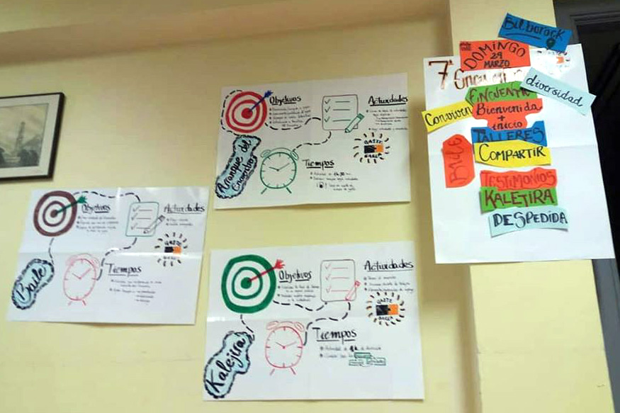 Después de debatir, compartir y reflexionar comenzamos a preparar el “encuentro de encuentros”: elegimos la ruta de la kalejira, inventamos una coreografía para nuestro baile y por supuesto diseñamos la dinámica de bienvenida con la que recibiremos a todas las personas valientes que decidan venir al encuentro. Por la noche nos trasladamos al cole Jesuitak y allí Martín Iriberri nos compartió una charla sobre valores, cambios sociales y religión. Después de cenar, demostramos nuestro talento (o nuestra falta de él) con una guitarrita y un coro formado por nuestro grupo y las personas que viven en Loiolaetxea.