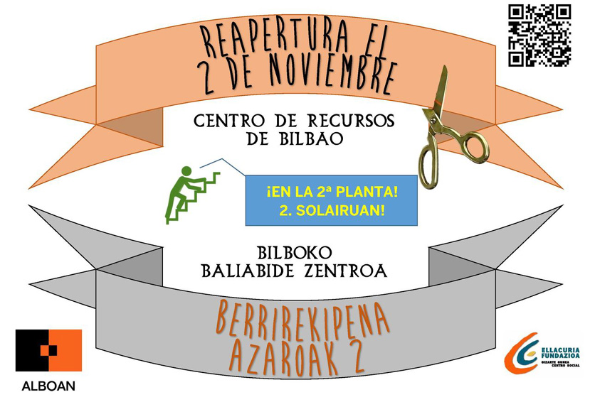 A partir del próximo 2 de noviembre el Centro de Recursos de ALBOAN y Fundación Ellacuria en Bilbao volverá a abrir sus puertas tras varios meses de cierre por traslado a la segunda planta. El horario de apertura se mantendrá igual: lunes de 16:00 a 19:00. Te invitamos a que te pases algún lunes a la tarde por Padre Lojendio 2, 2º (derecha) a visitarlo y ver la nueva distribución de materiales. Mientras tanto, puedes consultar toda la información actualizada y todos los recursos de los que disponemos en la página web del centro: http://centroderecursos.alboan.org/ ¡Esperamos verte pronto!