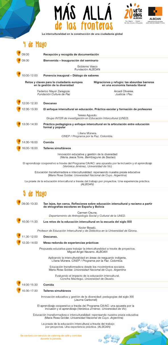 Desde ALBOAN queremos poner en valor las oportunidades que nos ofrece el trabajo desde la perspectiva intercultural y para ello hemos organizado un seminario internacional en el que poder compartir conocimientos y experiencias de Europa y América Latina. Para ello contamos con personas expertas en la educación intercultural, experiencias prácticas desde la innovación educativa, la educación popular, el trabajo cooperativo y colaborativo y el trabajo por proyectos, así como reflexiones que nos permitan situar la interculturalidad en un marco más amplio de análisis. Lugar: Salón de Actos de Arrupe Etxea. (Padre Lojendio, 2, Bilbao) Fechas: 4 y 5 de mayo del 2016 Inscripción: Inscripción gratuita previa en: http://edukalboan.alboan.org/seminario-interculturalidad/es-inscripción En el caso de los talleres que se realizan a las tardes se deben seleccionar por orden de preferencia y cada persona será asignada a dos de ellos según plazas disponibles y orden de inscripción. Plazas Limitadas Puedes consultar en programa del seminario.