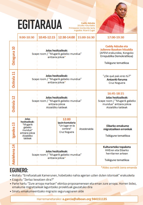 Proposamena martxoaren 10ean hasiko da, osteguna, 17: 00etan, Caddy Adzuba eta Julienne Baseke AFEMeko (Kongoko Errepublika Demokratikoa) bi emakume liderren hitzaldiarekin. Euren herrialdeko barne-migrazioari buruz hitz egingo digute. Era berean, antzerki-forum saio batera joan ahal izango gara ostiral arratsaldean, hilak 11, eta ipuin-kontalariaren saioa egingo da igande eguerdian. Asteburuan, Eibarko emakume migratzaileen erronkei buruzko topaketa izango dugu. Bertan, enpleguari, gizarte-baliabideei, prestakuntzari eta gizarteratzeari buruzko gaiak jorratuko dira. Kulturartekotasunari eskainitako une bat ere izango da, HHEren eta udalerriko herritarren eskutik.