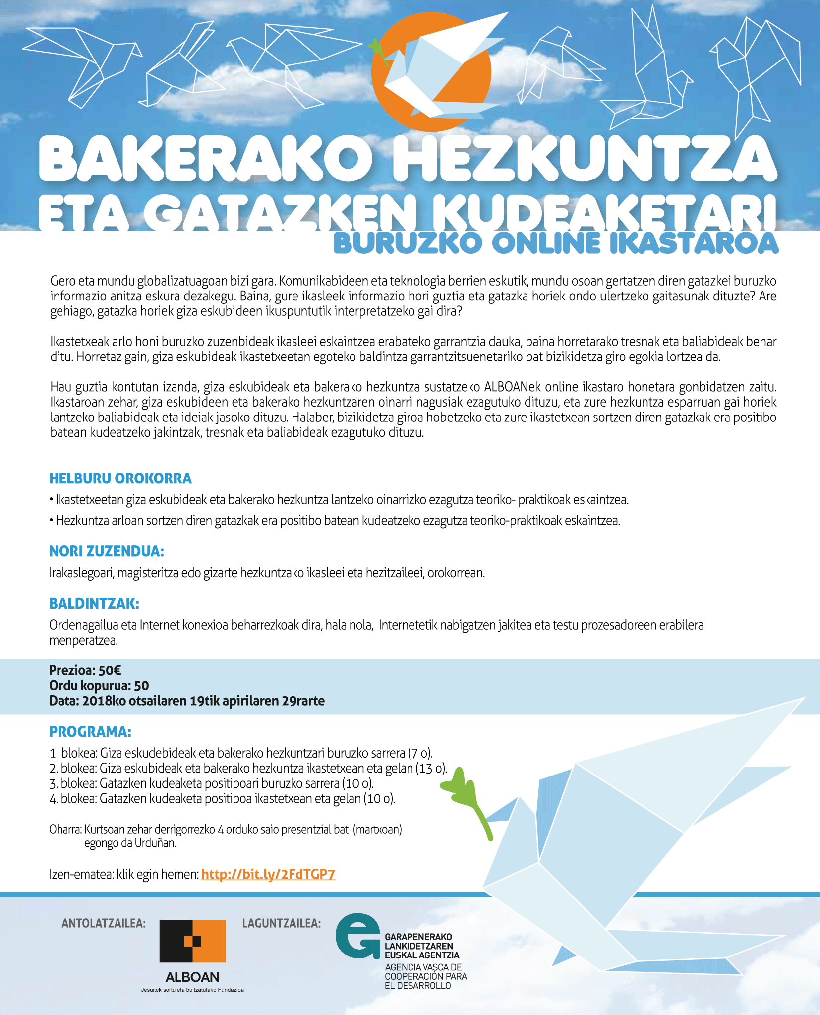 Hezkuntza eta gatazken kudeaketari buruzko online ikastaroaren 3. edizioa. Otsailaren 19tik apirilaren 29rarte. Proposamenak Giza Eskubideen eta bakerako hezkuntzaren oinarri nagusiak hurbildu nahi dizkio irakaslegoari. Ikastetxean sortzen diren gatazkak era positiboan kudeatzeko jakintzak, tresnak eta baliabideak eskaintzen ditu ikastaro honek. Nori zuzendua: Irakaslegoari, magisteritza edo gizarte hezkuntzako ikasleei eta hezitzaileei, orokorrean. Prezioa: 50€ Iraupena: 50 ordu, otsailaren 19tik apirilaren 29rarte. Programa: