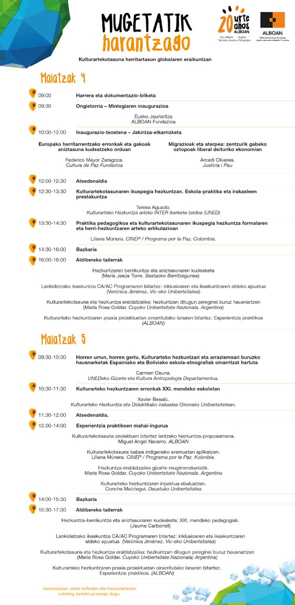 ALBOANetik lanak kulturarteko ikuspegitik eskaintzen dizkigun aukerak balioetsi nahi ditugu, eta horretarako, nazioarteko mintegi bat antolatu dugu Europako eta Latinoamerikako ezaguerak eta bizipenak partekatu ahal izateko; lankidetza ulertzeko modu berri batean oinarrituko gara, eta bertan, bideak eta ezaguerak joan-etorrikoak izango dira, elkarrekintzan oinarrituko dira. Horretarako, kulturarteko hezkuntzan, hezkuntzaren berrikuntzako esperientzia praktikoetan, herri-hezkuntzan, lankidetza-lanean eta proiektu bidezko lanean adituak diren pertsonak izango ditugu, baita kulturartekotasuna azterketa-eremu zabalagoan kokatzea ahalbidetuko diguten hausnarketak ere. Lekua: Arrupe Etxeko ekitaldi-aretoan (Aita Lojendio 2, Bilbo) Egunak: 2016ko maiatzaren 4an eta 5ean Izena eman: Honako esteka honetan aurretiaz eta doan izena eman ahal izango duzu: http://edukalboan.alboan.org/seminario-interculturalidad/eu-inscripcion. Arratsaldez egiten diren tailerren kasuan, lehentasun-ordenaren arabera aukeratuko dira, eta pertsona bakoitzari horietako bi tokatuko zaizkio, libre dauden lekuen eta inskripzio-ordenaren arabera. Plaza mugatuak Mintegiko programa ikus dezakezu hemen.